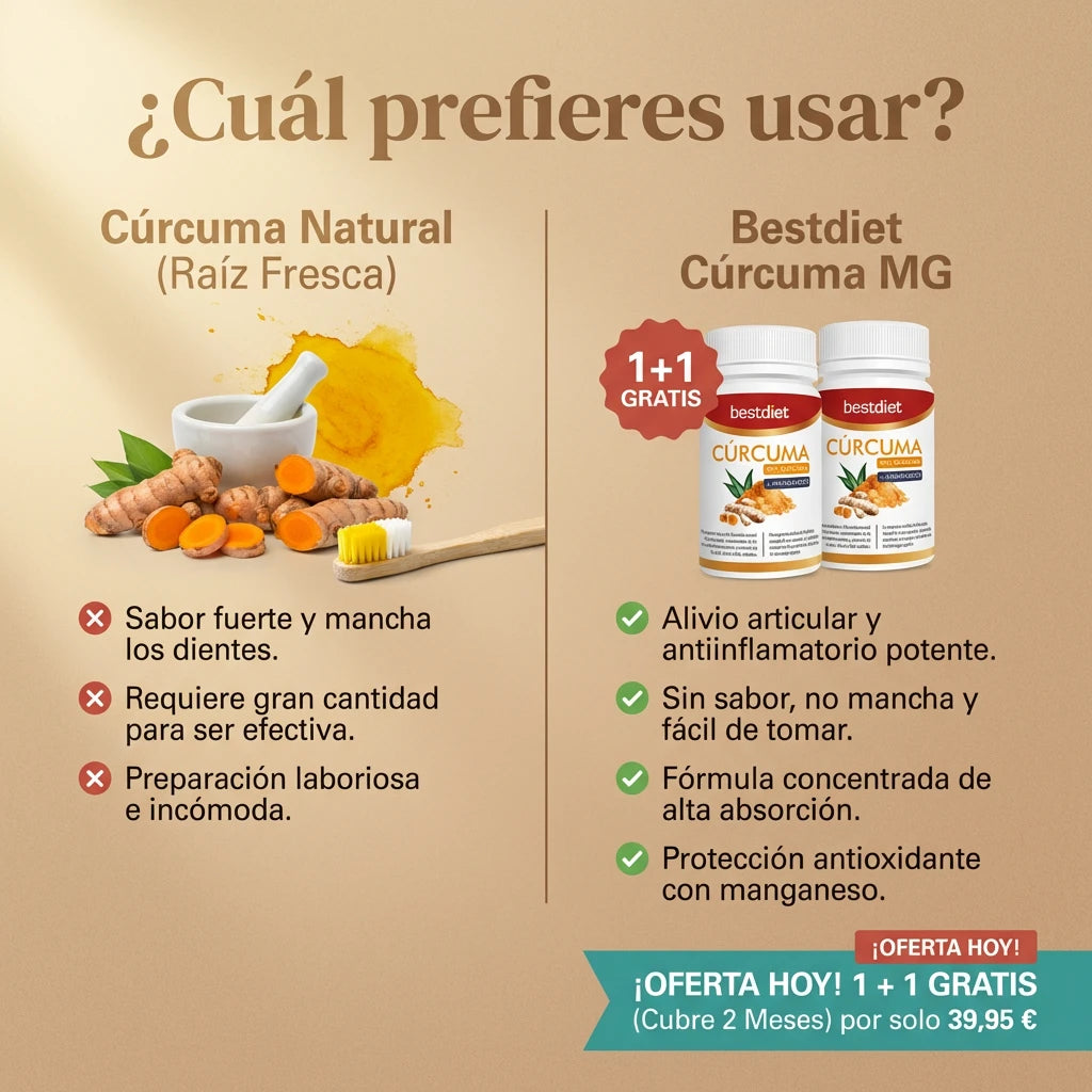 📍 "Después de las Navidades tenía el cuerpo destrozado: articulaciones rígidas, digestiones pesadas, hinchazón... Mi hija me regaló Cúrcuma MG y en 3 semanas noto que me levanto mejor por las mañanas. Ya no tardo media hora en poder moverme."